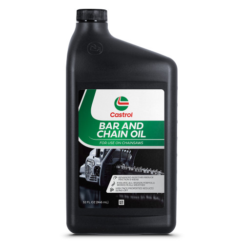 Castrol Bar & Chain Oil - 32oz Castrol Bar and Chain Oil is specially formulated to protect your chainsaw from friction and wear and features unique additives to ensure your equipment can handle anything thrown at it. Our evolved formula provides an all-season toughness that handles any temperature and contains high tacking properties to reduce sling-off. Can be used with all chainsaws, pole saws, or hedge trimmers that use slide bars or chain gears. DIRECTIONS: Gas chainsaws usually use 1 tank of bar and chain oil per tank of fuel, so refill after each fuel-up. 1- place chainsaw on flat surface 2- unscrew cap to reservoir and pour in bar and chain oil. DO NOT overfill. 3- screw cap back on, wipe any excess off outside of equipment. Additional Information Safety Data Sheet
