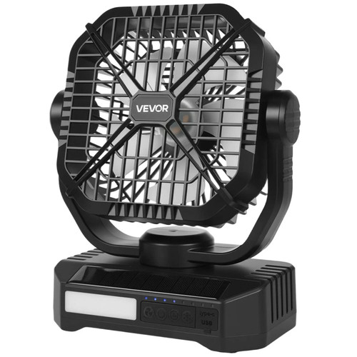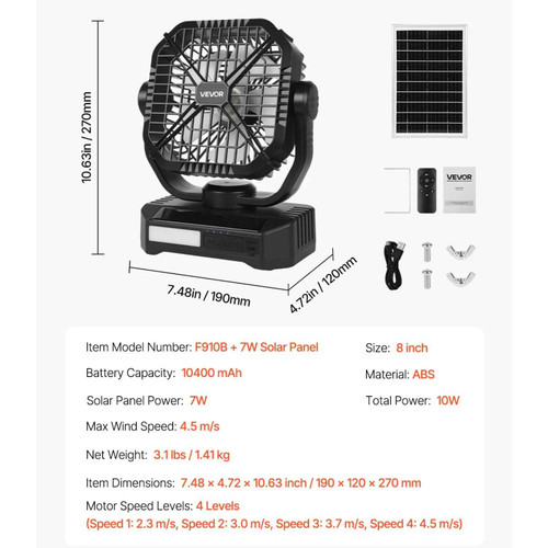 Downloads and manuals associated to VEVOR 10400mAh Solar fan, Camping Fan with Solar Panel & LED Lantern, 7W 8 Inch Portable Rechargeable Battery Powered for Outside, 4-Speed and Quiet Operated for Picnic, Barbecue, Fishing, Travel