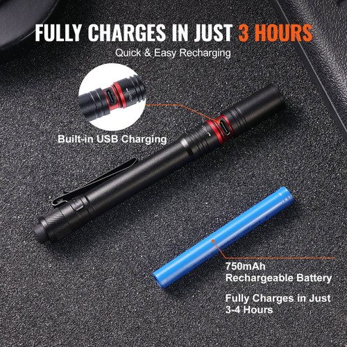 Downloads and manuals associated to VEVOR 5.9 Inch Rechargeable Penlight, 300 lumens 3 Lighting Modes Pocket Pen Light, Adjustable Focus, IP44 Waterproof, Aluminum Alloy for Camping, Reading, Repairing, Night Walking