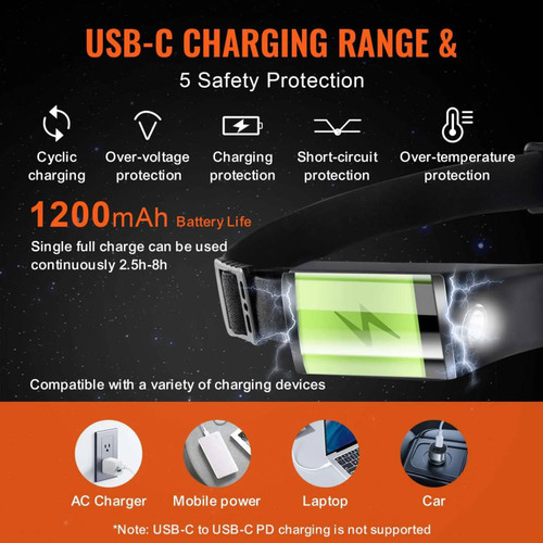 Intelligent sensing mode, detecting the waving hand automatically lights up; Built-in 1200mAh rechargeable battery, about 2h can be fully charged, full battery can last 2.5h-8h; 2.6 oz weight, silicone rubber material, lighter and more comfortable.